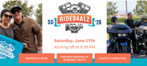 Change lives and register for Rides4ALZ, taking place on June 27th, 2026! This year will be our 10th annual motorcycle fundraiser, and we count on loyal riders and passengers like you to help raise critical funds for the nearly 100,000 people living with dementia in San Diego County. This year we have a new route and starting point – we’ll be kicking off the ride in Escondido! The ride will conclude at Kit Carson Park, which is where we’ll hold the after party. Here’s how to register: 1) Go to alzsd.org/rides and click “Register as a Rider” to sign up.